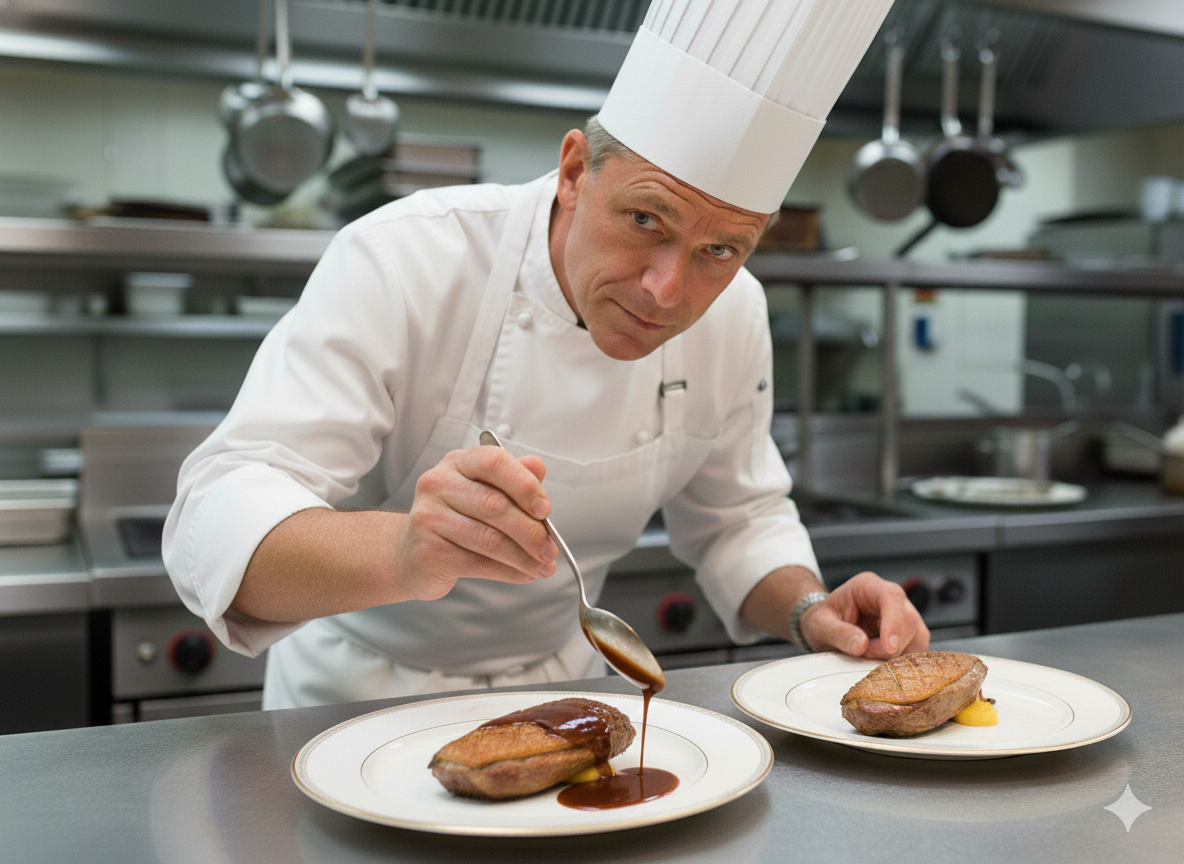 While their stomachs are growling and about to declare war, I have nearly finished plating my tender duck breasts with a delicate blanket of my special sauce. Suddenly, just as I am about to start spooning my precious sauce over the last breast, Lea comes around the corner into the kitchen with the fury of Jason Bourne tearing through the streets of Paris on a motorcycle. She screeches to a halt within 2" of me, and with her face so close I could feel her hot breath huffing and puffing and declares: