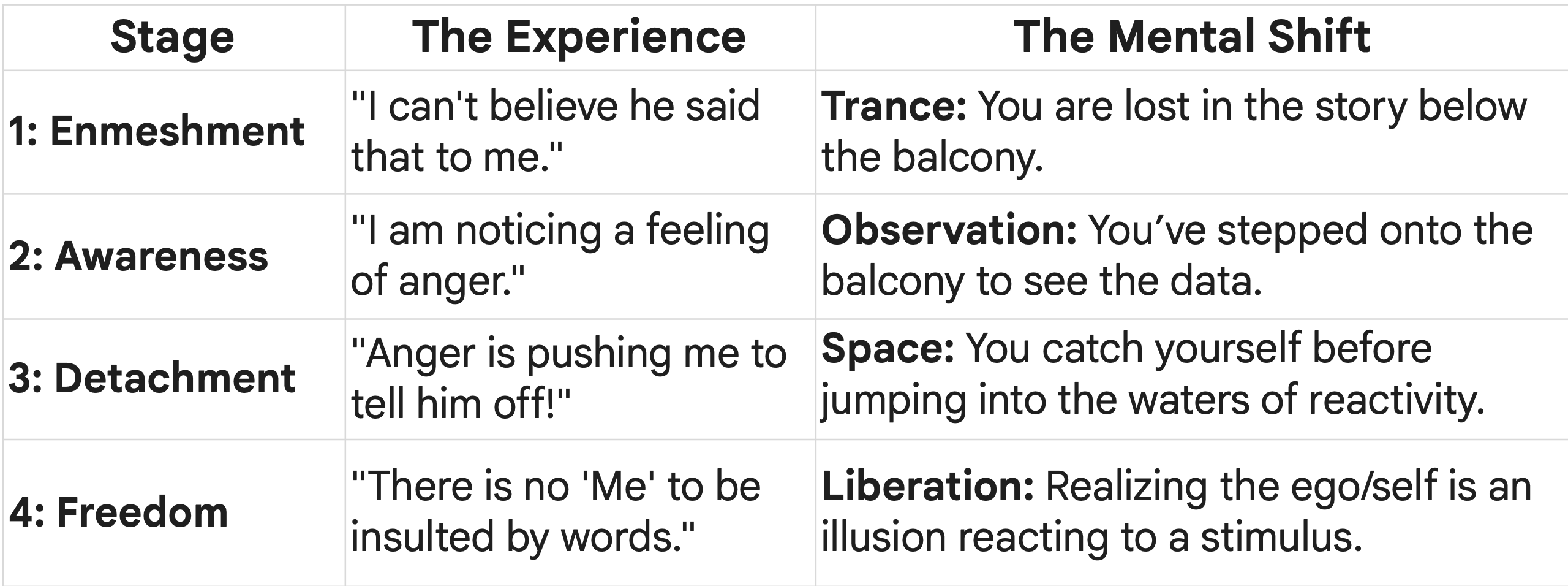 Here is a table showing the stages of "enlightenment."